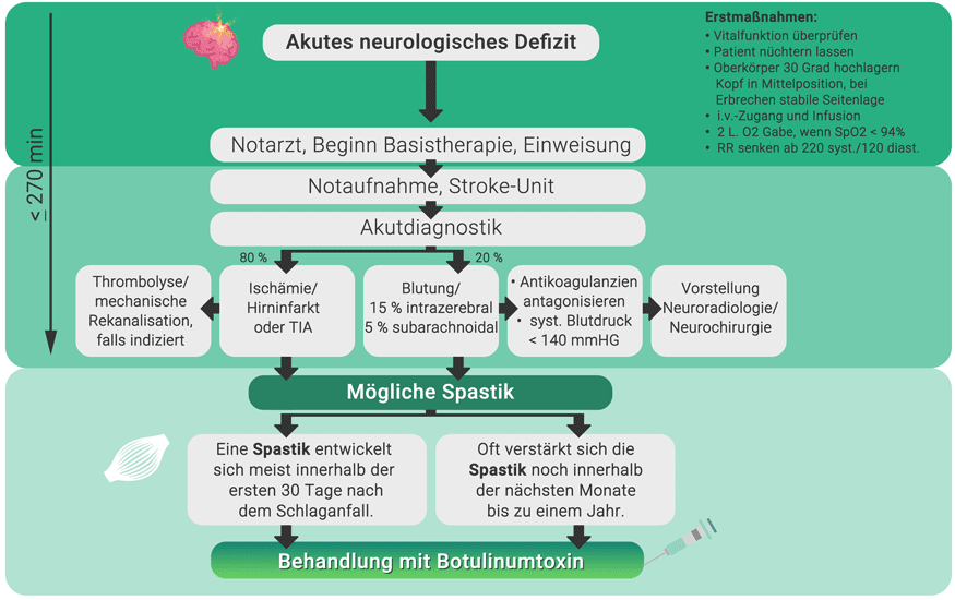 Spastik entwickelt sich meist innerhalb der ersten 30 Tage nach dem Schlaganfall bei etwa einem Viertel der Betroffenen. Oft verstärkt sich die Spastik noch innerhalb der nächsten Monate bis zu einem Jahr.