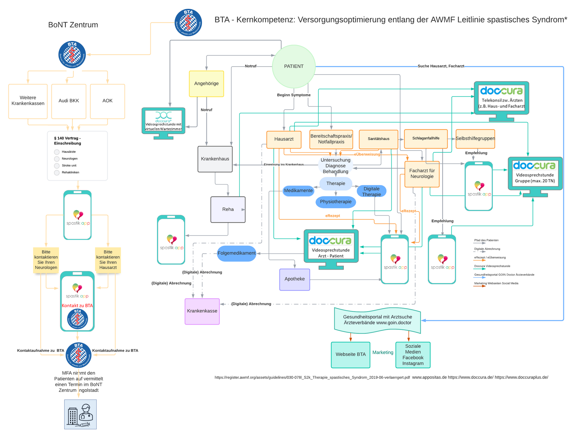 Yukarıdaki görsel, AWMF kılavuzlarına göre spastisiteli bir felç hastasının bakım sürecine dair kapsamlı bir genel bakış sunmaktadır. Teşhisten tedaviye kadar çeşitli adımları gösterir ve spastisite uygulamamızı kullananların botulinum toksin tedavisi uygulayabilecek bir doktoru hızlı ve kolay bir şekilde bulmalarını sağlar.