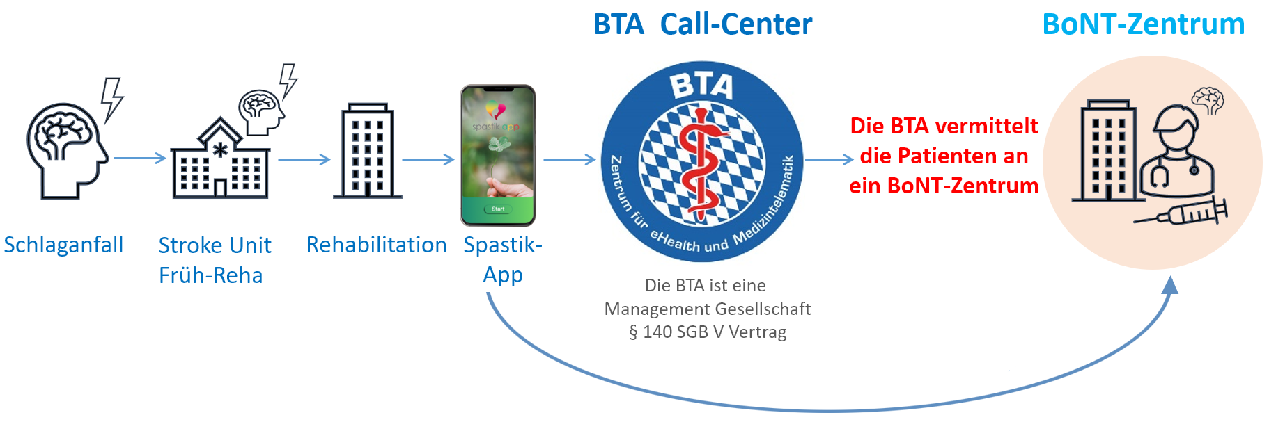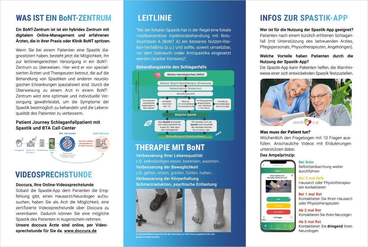 Hastalar ayrıca www.telemedallianz.de adresindeki spastisite uygulaması aracılığıyla doğrudan BTA ile iletişime geçebilirler. www.doccura.de adresindeki doccura aracılığıyla çevrimiçi video konsültasyonu için randevu alma veya BoNT merkezinizde randevu alma seçeneği sunuyoruz.
