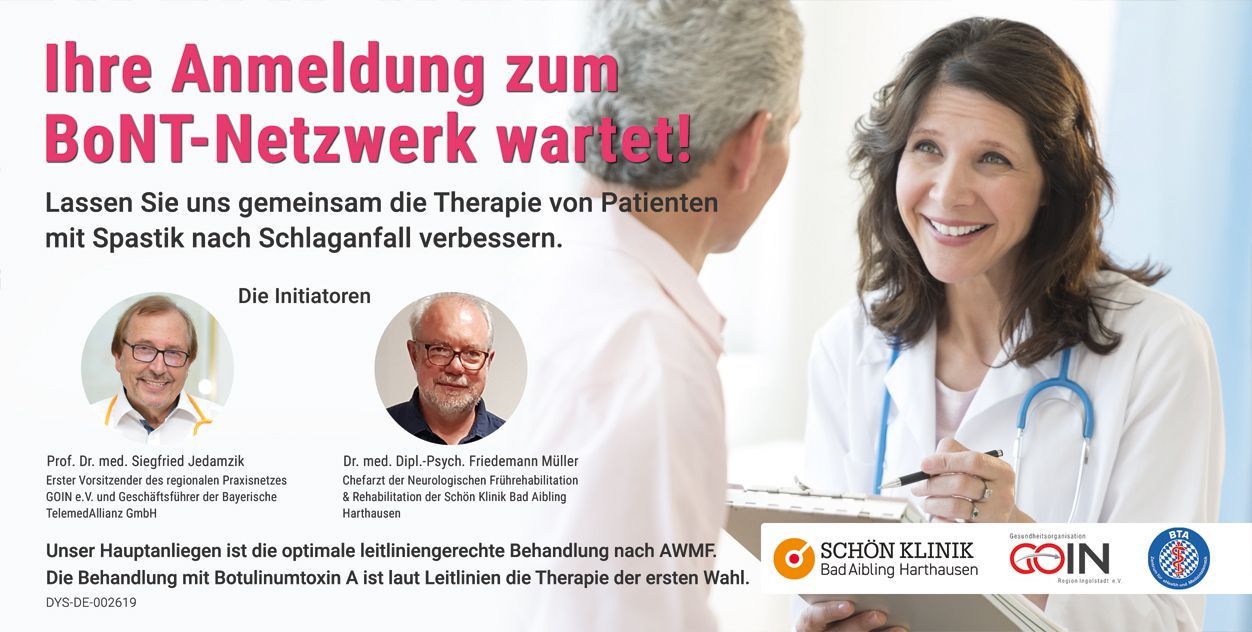 Prof. Dr. Siegfried Jedamzik (tıp doktoru) ve Friedemann Müller (tıp doktoru, Dipl.-Psych.), spastisiteli inme hastalarının tedavi sonrası bakım sürecini yeniden tanımlamak üzere ortak bir girişim başlattık. Bilgisayar bilimleri profesörü, GOIN eV (www.goin.info.) ve MediBayern eV (www.medi-bayern.de) yönetim kurulu başkanı ve 30 yılı aşkın pratisyen hekimlik deneyimine sahip Prof. Dr. Jedamzik, spastisiteli inme hastalarının tıbbi bakımına derinlemesine bakış açısı getiriyor. Schön Klinik Bad Aibling Harthausen'da (www.schoen-klinik.de/bad-aibling-harthausen) Nörolojik Erken Rehabilitasyon ve Rehabilitasyon Başhekimi olan Dr. Friedemann Müller (tıp doktoru, Dipl.-Psych.), bu uzmanlığı nöroloji alanındaki özel bilgi ve klinik deneyimiyle tamamlıyor.